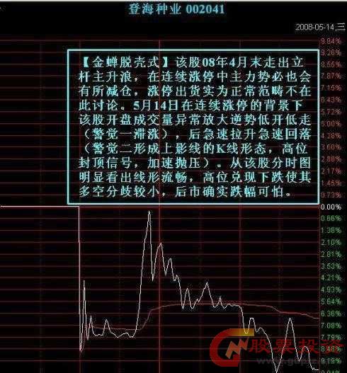 该 形态大多出现股价直线上涨之后,所以基本在此之前很多投资者要么被洗出局,要么止盈离场,所以基本无太大杀伤力。只是知道在大涨之后离大跌就不远了,所以 连续涨停个股进入有风险,追涨需谨慎。一旦一时心血来潮进入,走出如此形态即需回避离场。判断一只个股是否脱壳其实成交量已经不大管用,这种短期爆炒个股 均放大成交量,主要可观察分时中回调的力度和空间,不能一概而论。